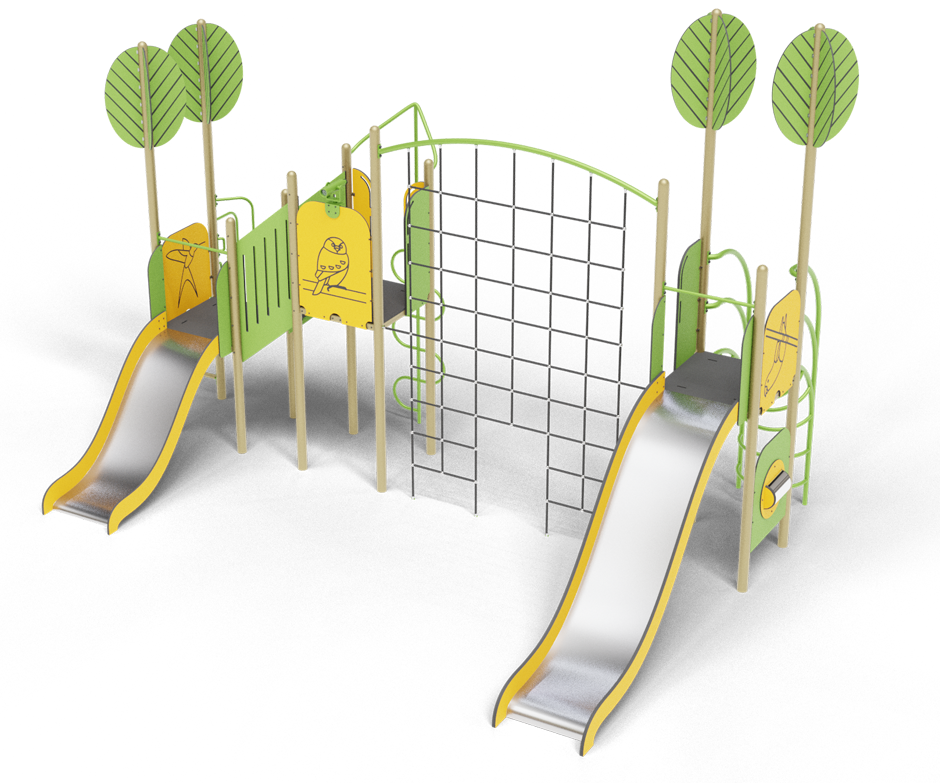 Игры в лесу прямо в городе — это ли не мечта? Представляем вам захватывающий детский игровой комплекс в стилистике «Лес Чудес», который обещает принести ваших детей в мир волшебства и приключений. Этот комплекс включает две зоны с горками, соединенные лазательным комплексом из канатной сетки, лестницу и подъем по прутьям, предлагая детям множество возможностей для развлечений и активных игр.