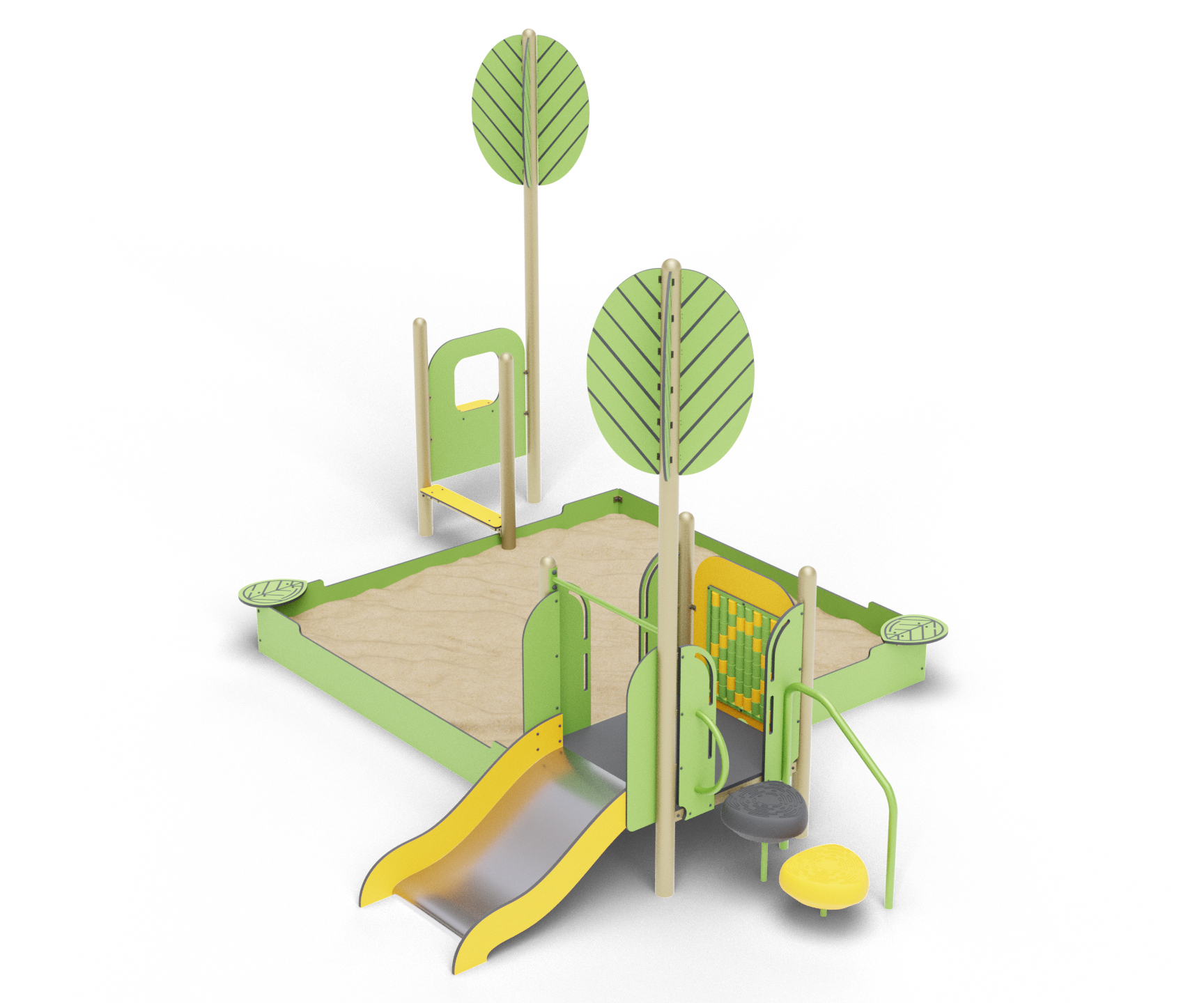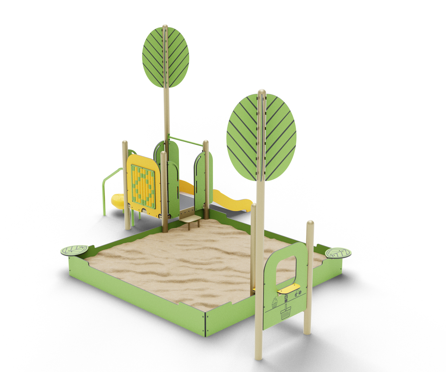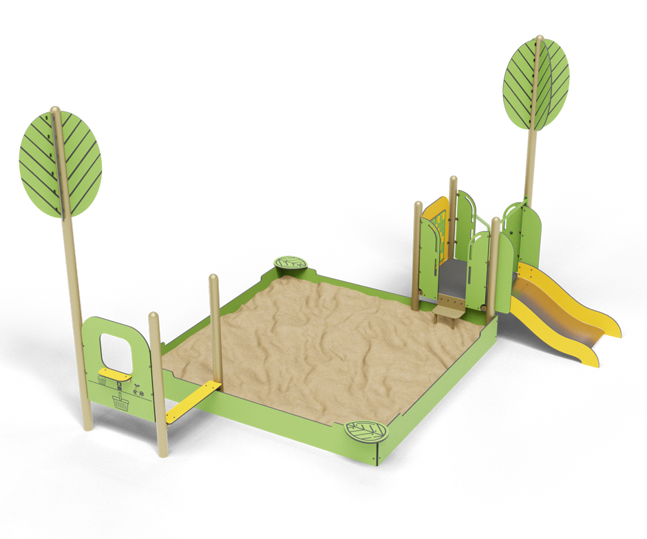 Этот детский игровой комплекс в стиле «Лес Чудес» сочетает в себе песочницу, уютный домик без крыши для фантазий и захватывающую горку, предлагая малышам разнообразные развлечения. Пусть ваш ребенок окунется в мир приключений, строит домики из песка, спускается по горке и творит чудеса в уютном уголке.