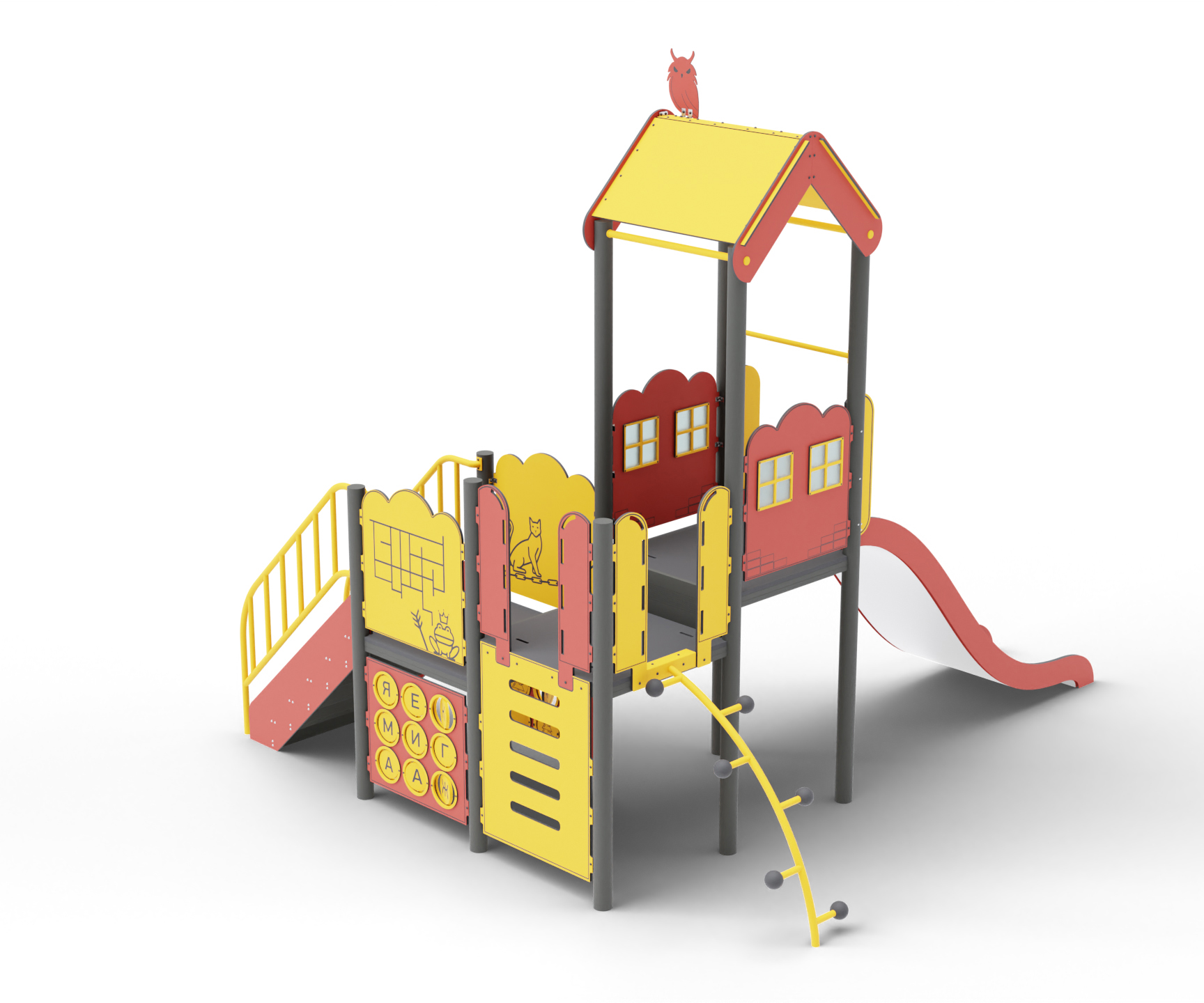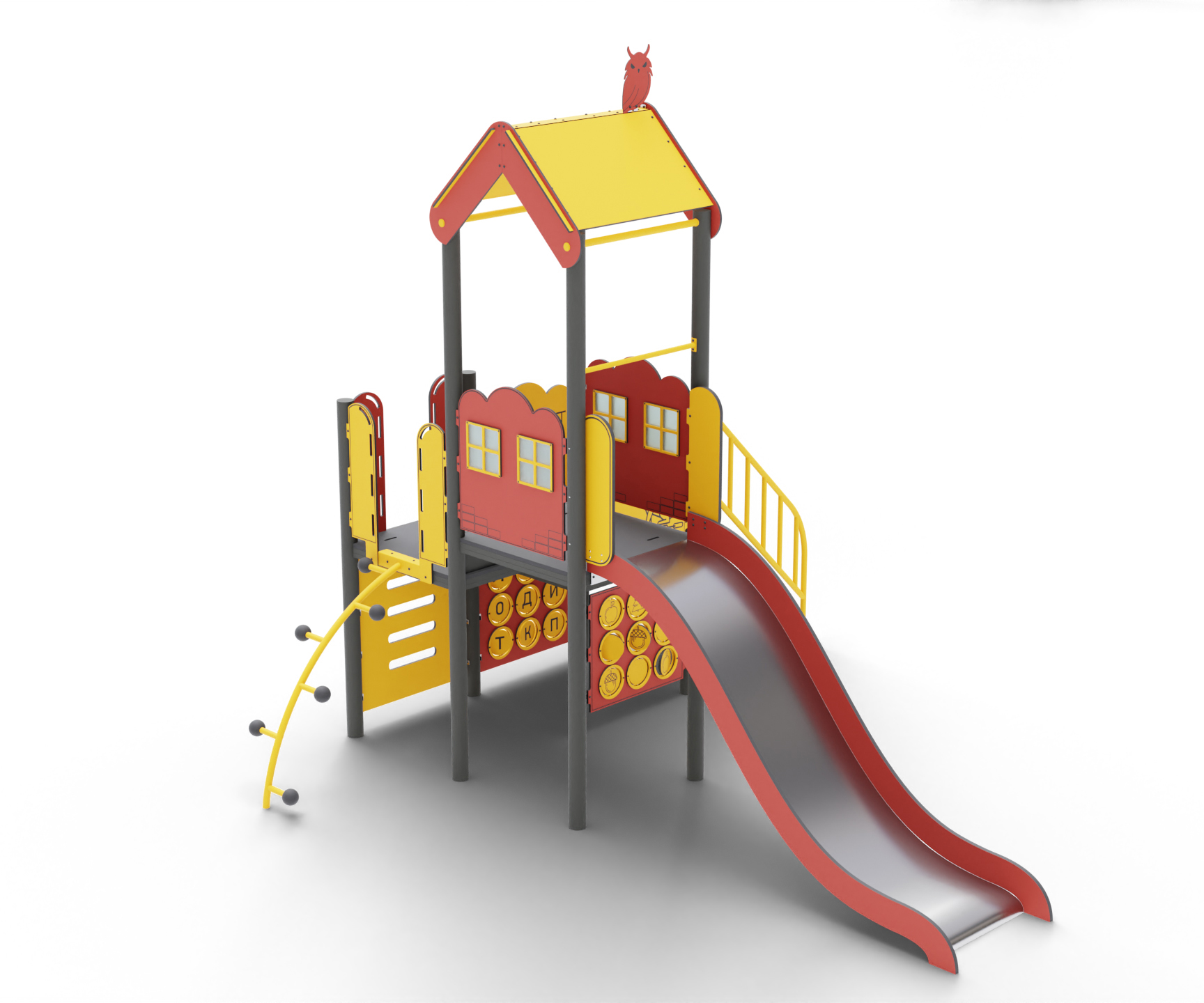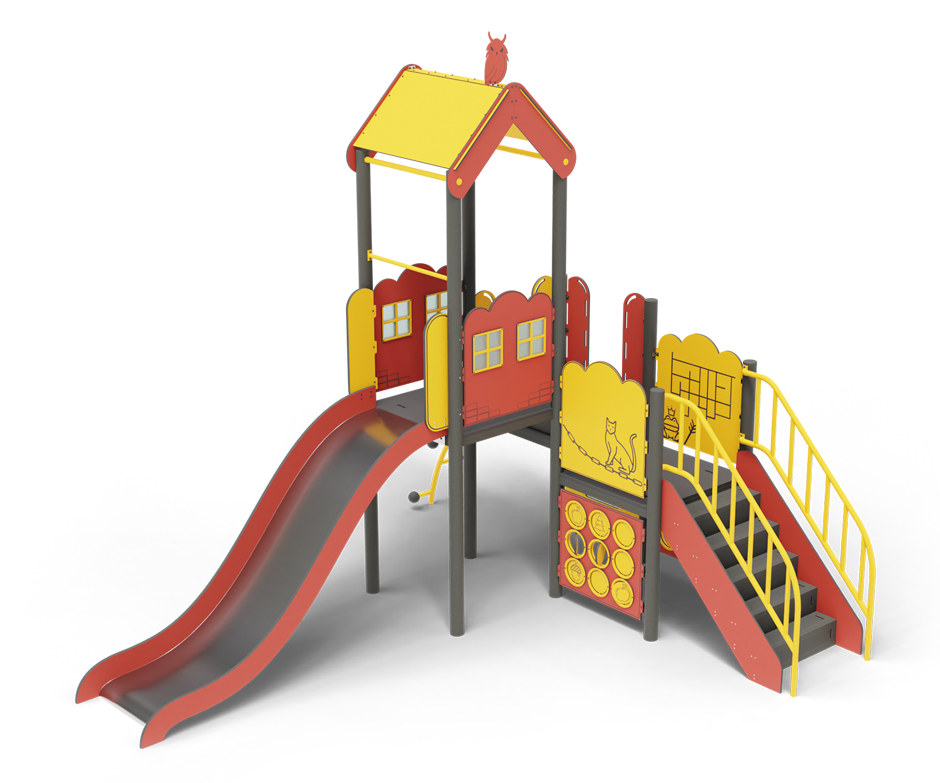 Этот захватывающий детский игровой комплекс несет в себе множество игровых возможностей, включая горку, два вида лестниц и разнообразные игровые панели.