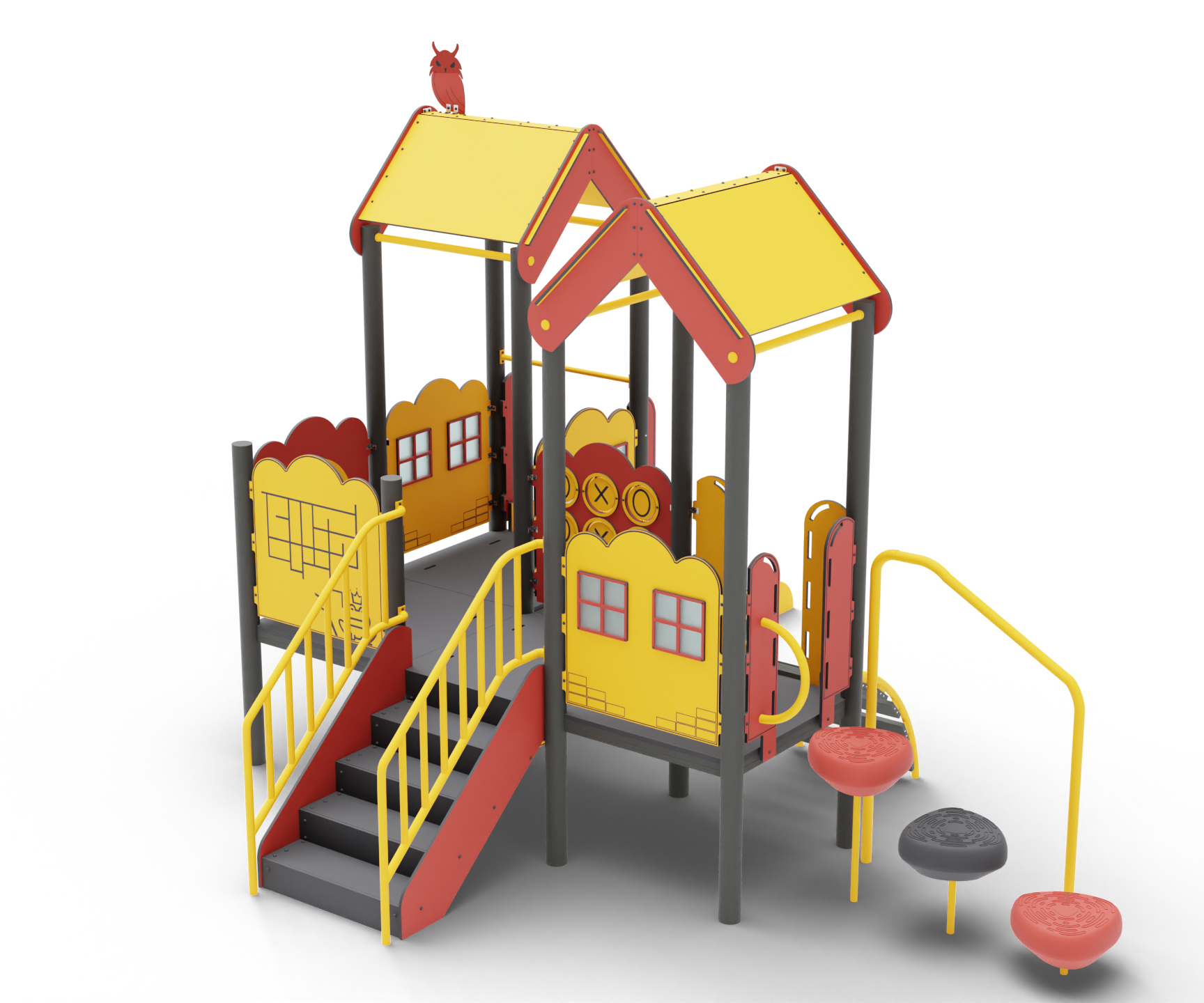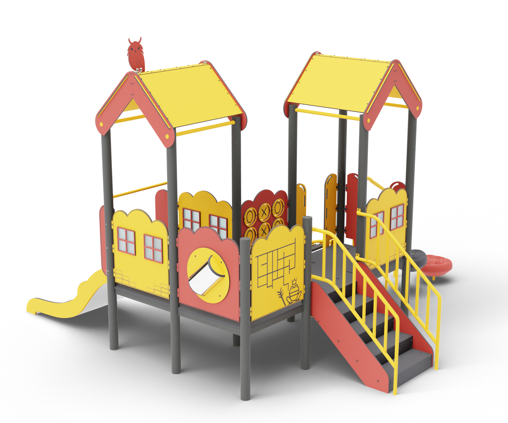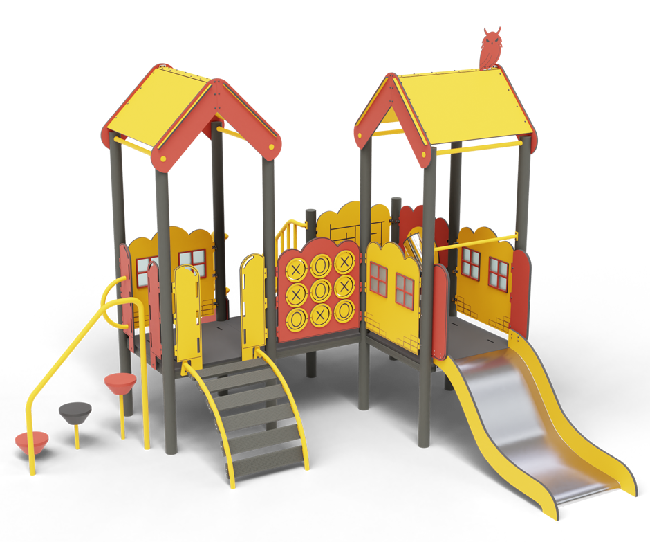 Этот уникальный комплекс представляет собой угловую конструкцию, оснащенную горкой, двумя видами подъема и игровой панелью, создавая идеальное пространство для развлечений на вашей игровой площадке.