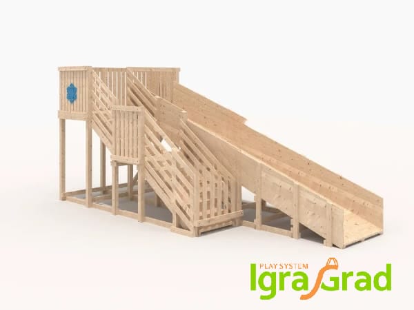 - Качество и долговечность: Несущая конструкция выполнена из дерева, прошедшего все этапы обработки. Специальная нетоксичная пропитка защищает горку от ультрафиолета и осадков, сохраняя ее внешний вид на долгие годы.