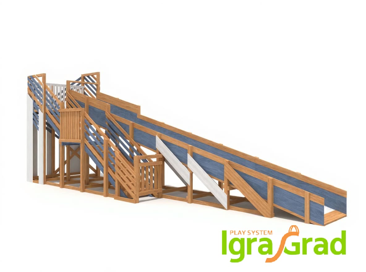 - Максимальная безопасность: Борта ската предотвращают преждевременный вылет, а высокие перила на лестнице и платформах обеспечивают безопасность даже при большом количестве детей.